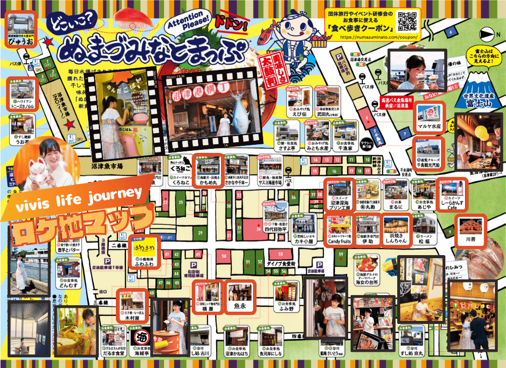 このページでは、Viviさんが実際に訪れたスポットをピックアップ。店舗の魅力やViviさんが堪能されたものをご紹介しつつ、「ロケ地マップ」をご案内します。台湾の皆さんも、日本国内の皆さんも、Viviさんの感動を追体験して、沼津港の魔法にハマっちゃおう!